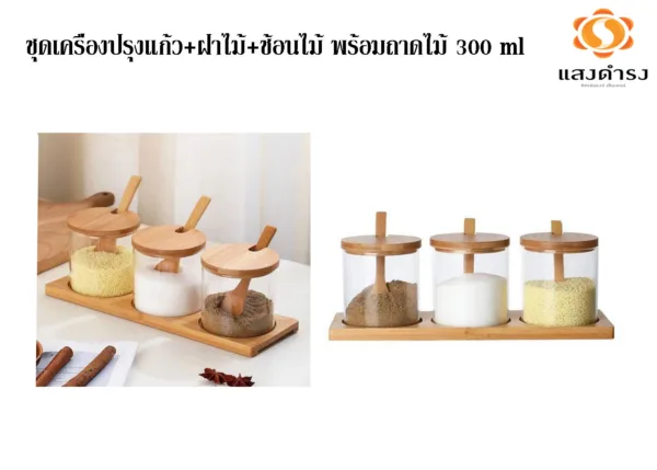 ชุดเครื่องปรุงแก้ว+ฝาไม้+ช้อนไม้ พร้อมถาดไม้ 300 ml
